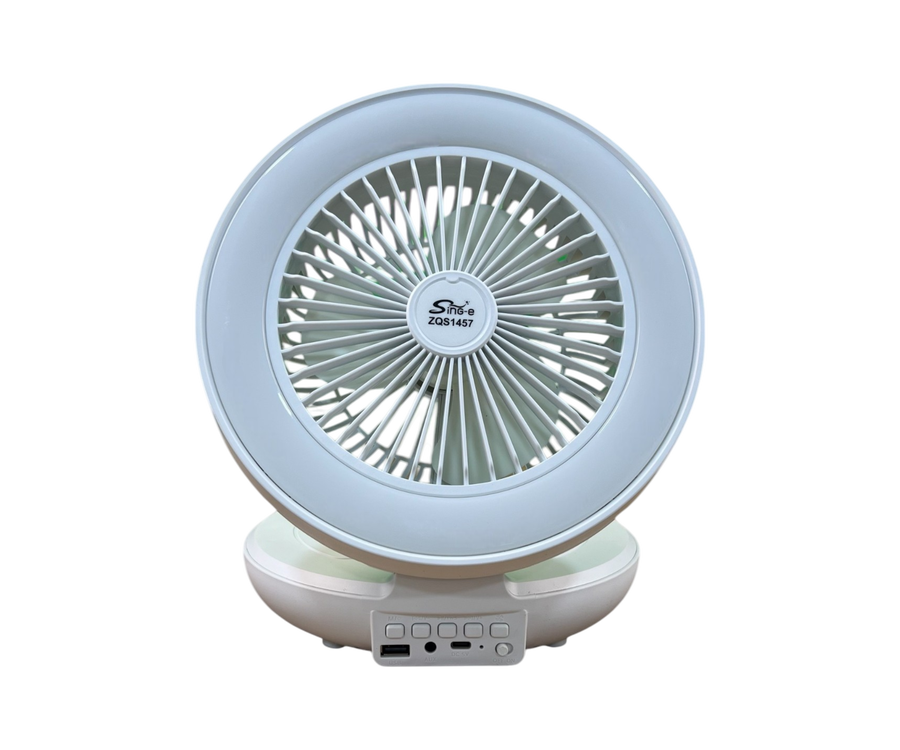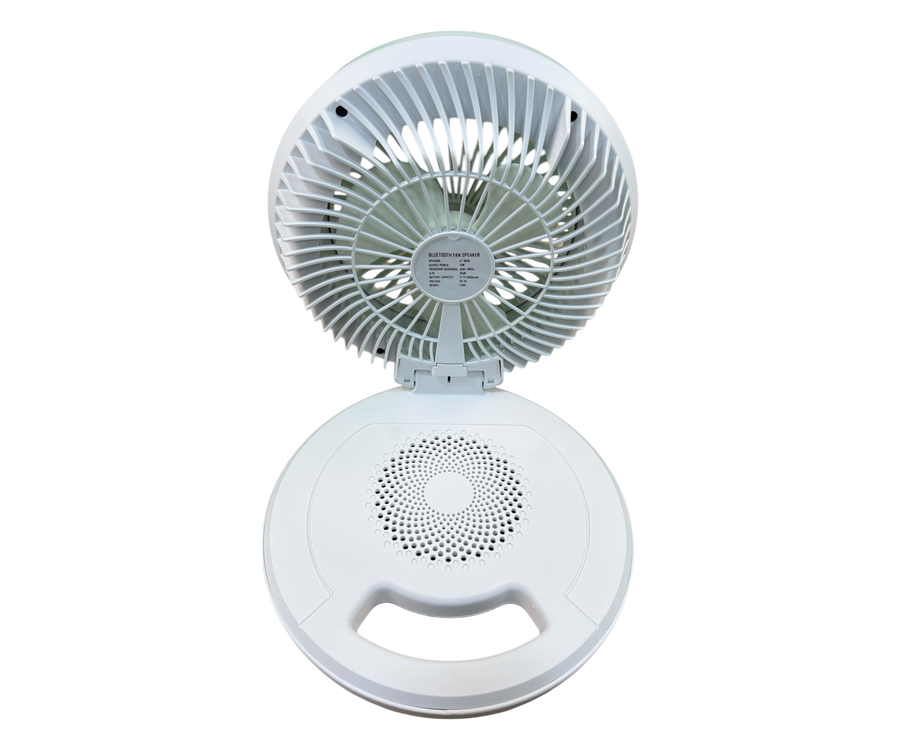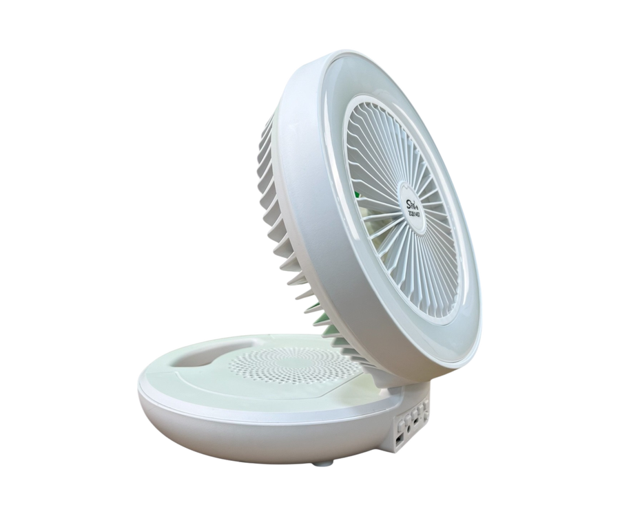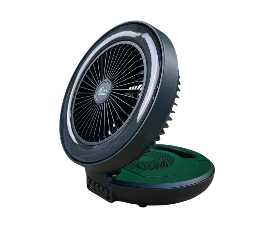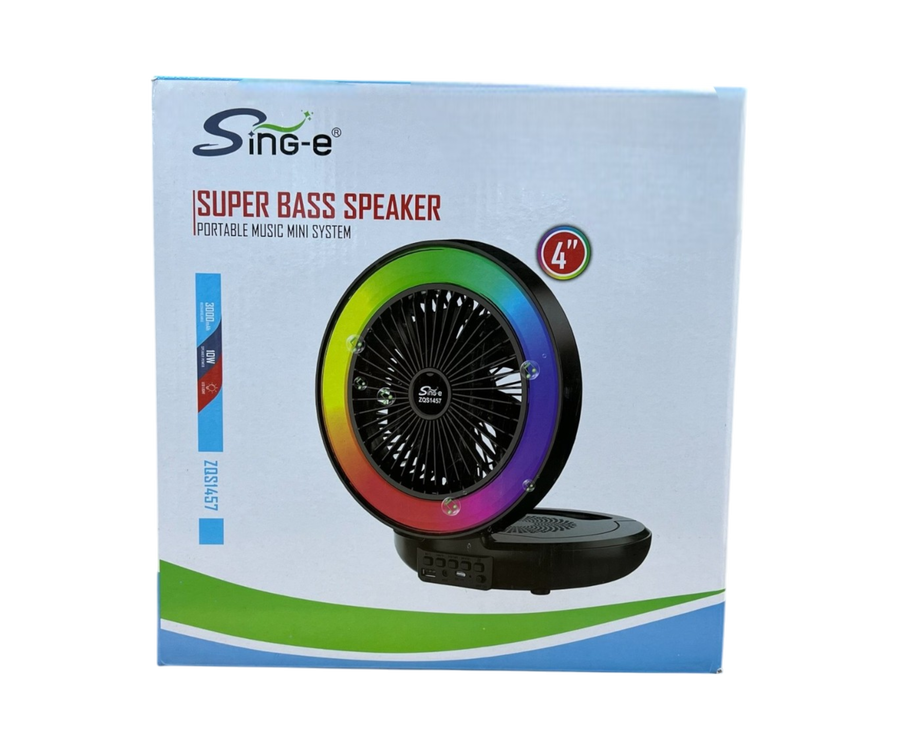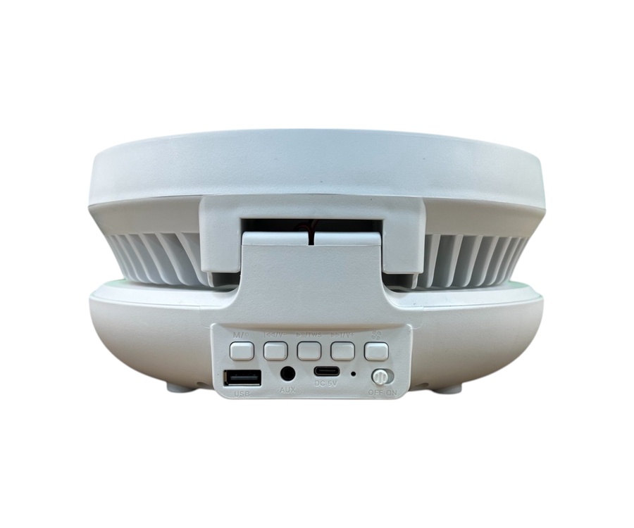 مكبر صوت محمول مع مروحة مدمجة وإضاءة LED ملونة، يدعم البلوتوث وUSB وAUX لتجربة صوتية مميزة