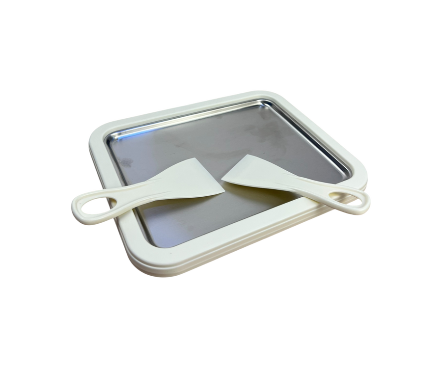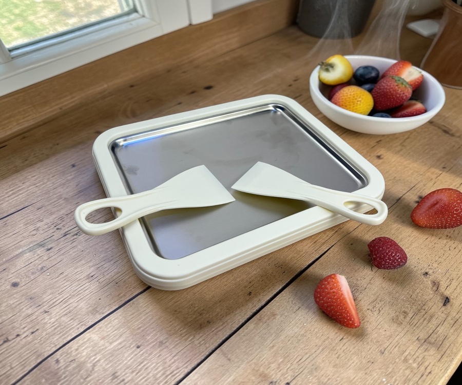 يأتي مع ملعقتين مسطحتين (Spatula) لتقليب الآيس كريم وصنع الرول بسهولة.
