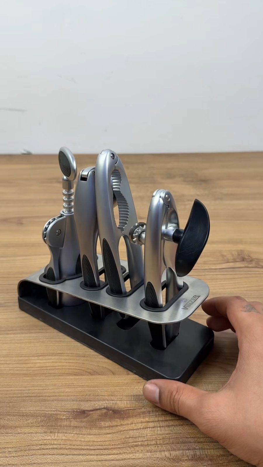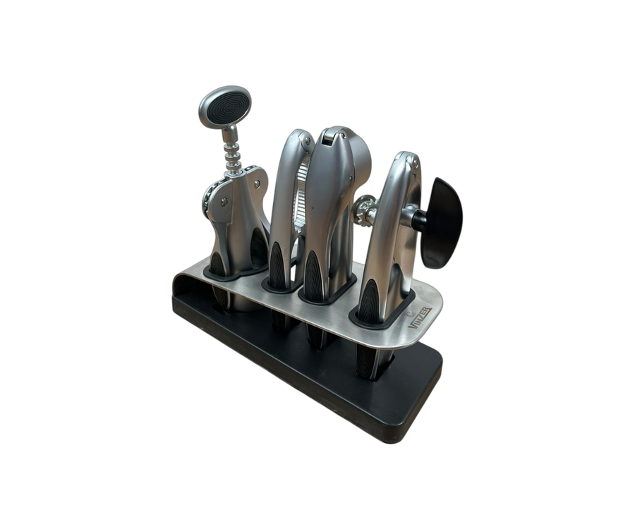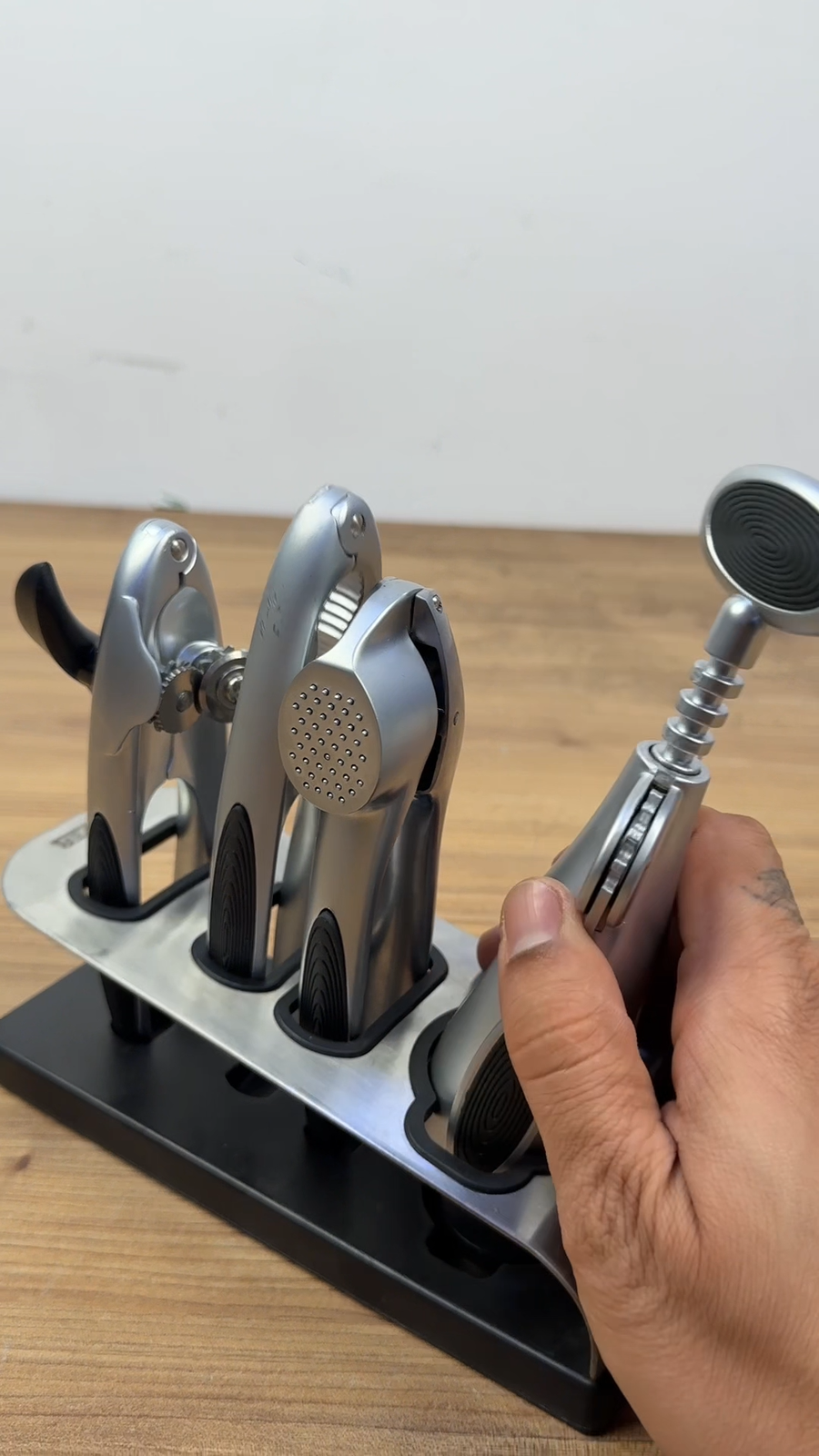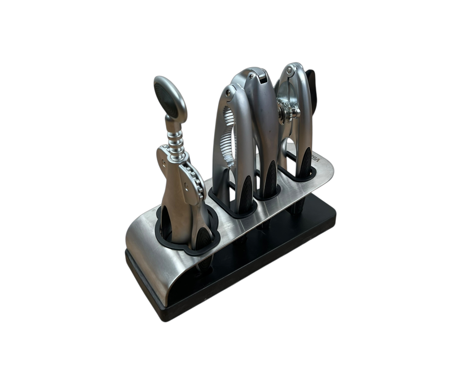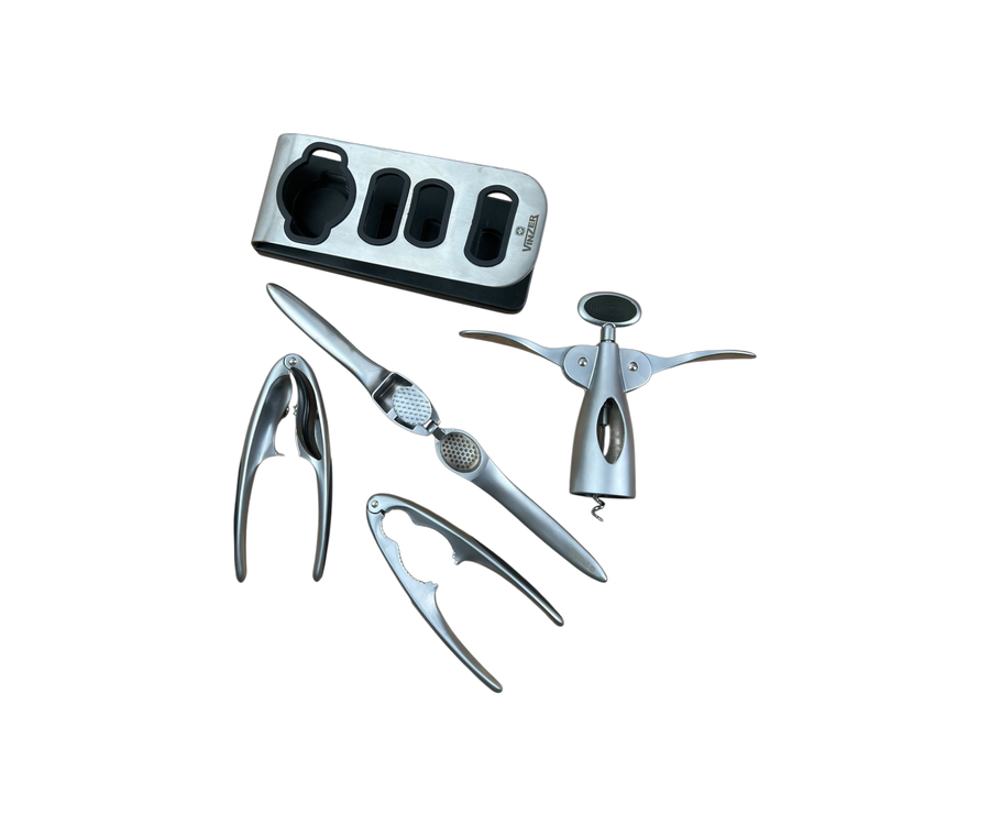 مجموعة متكاملة 5 قطع: فتّاح علب، كسارة مكسرات، فتّاح قناني، عصّارة ثوم، إضافة إلى حامل ثابت.
