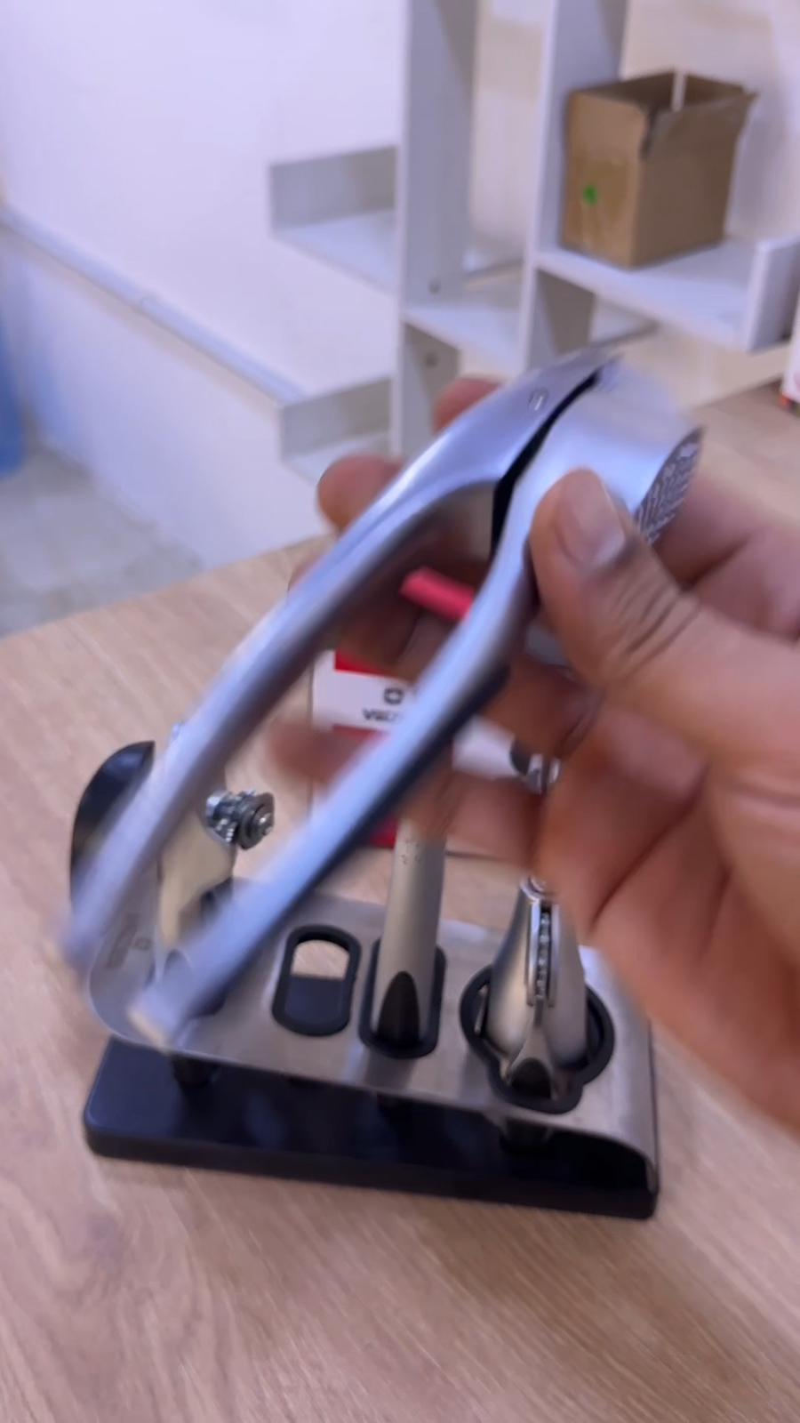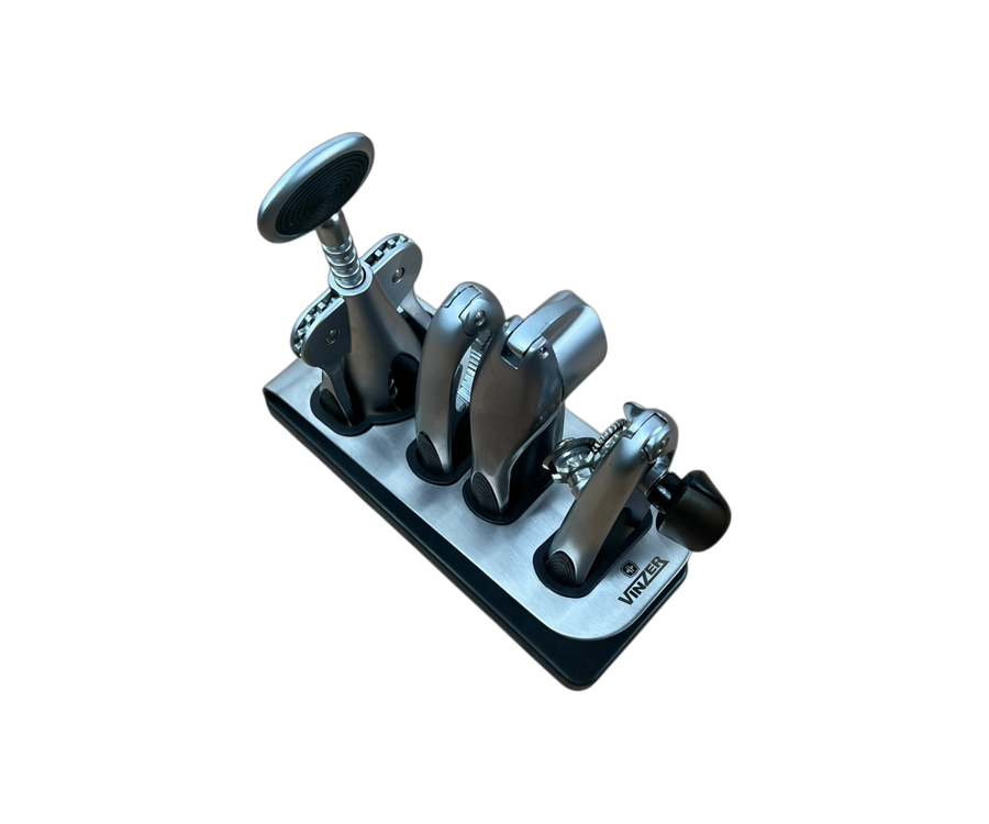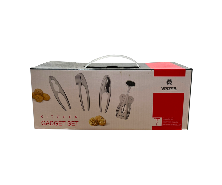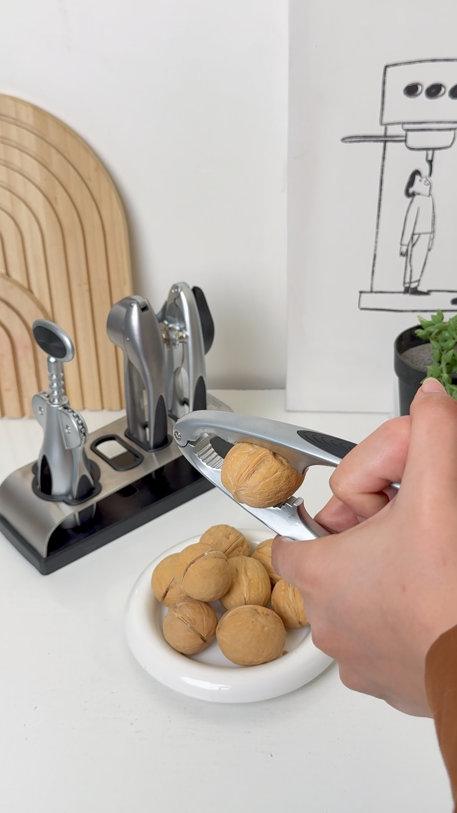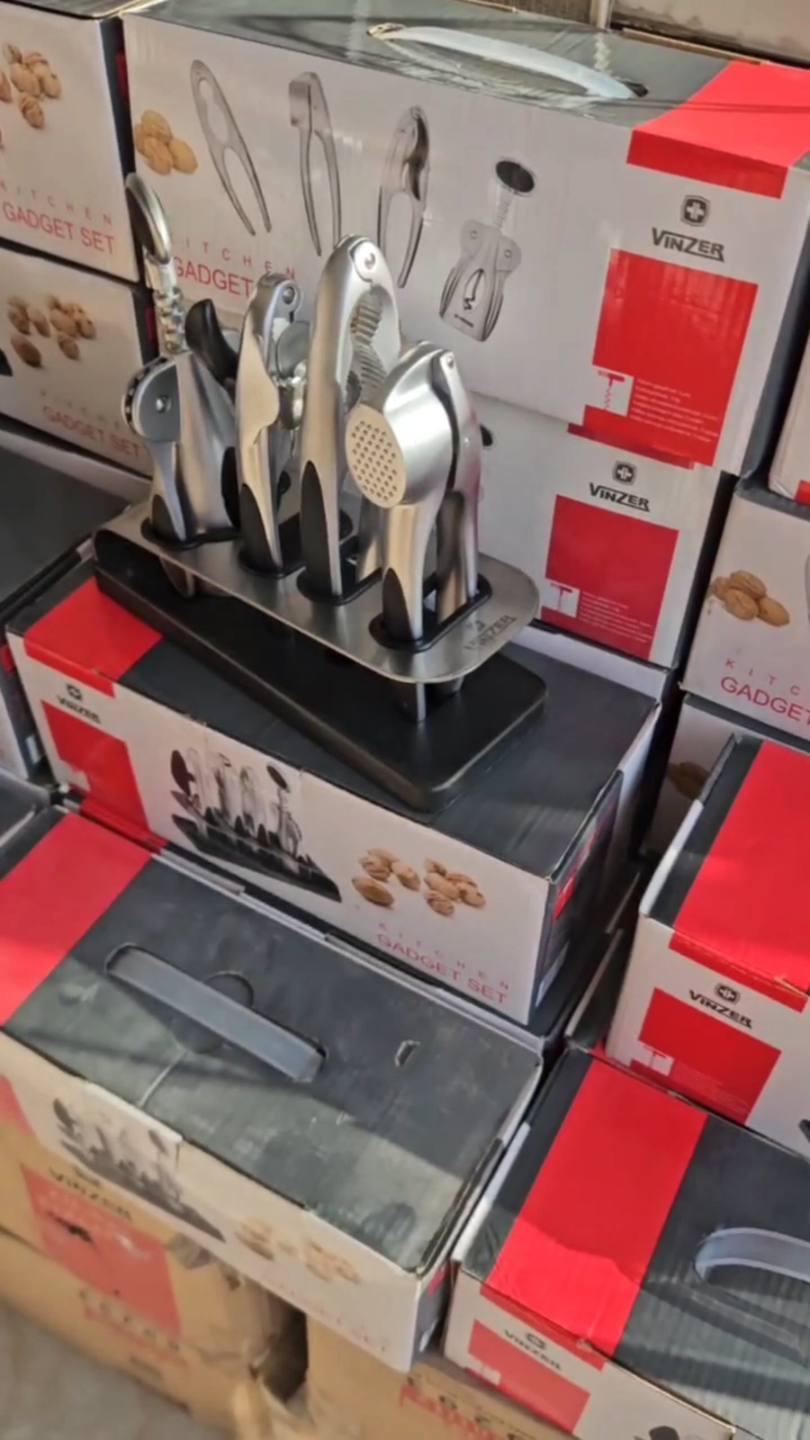 مجموعة متكاملة 5 قطع: فتّاح علب، كسارة مكسرات، فتّاح قناني، عصّارة ثوم، إضافة إلى حامل ثابت.